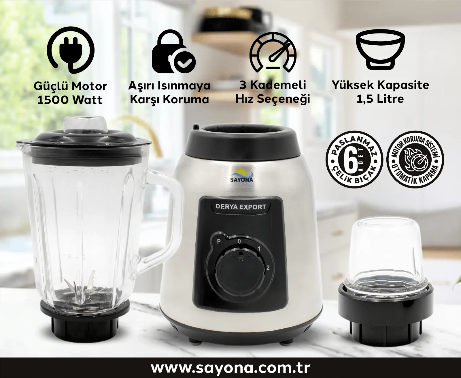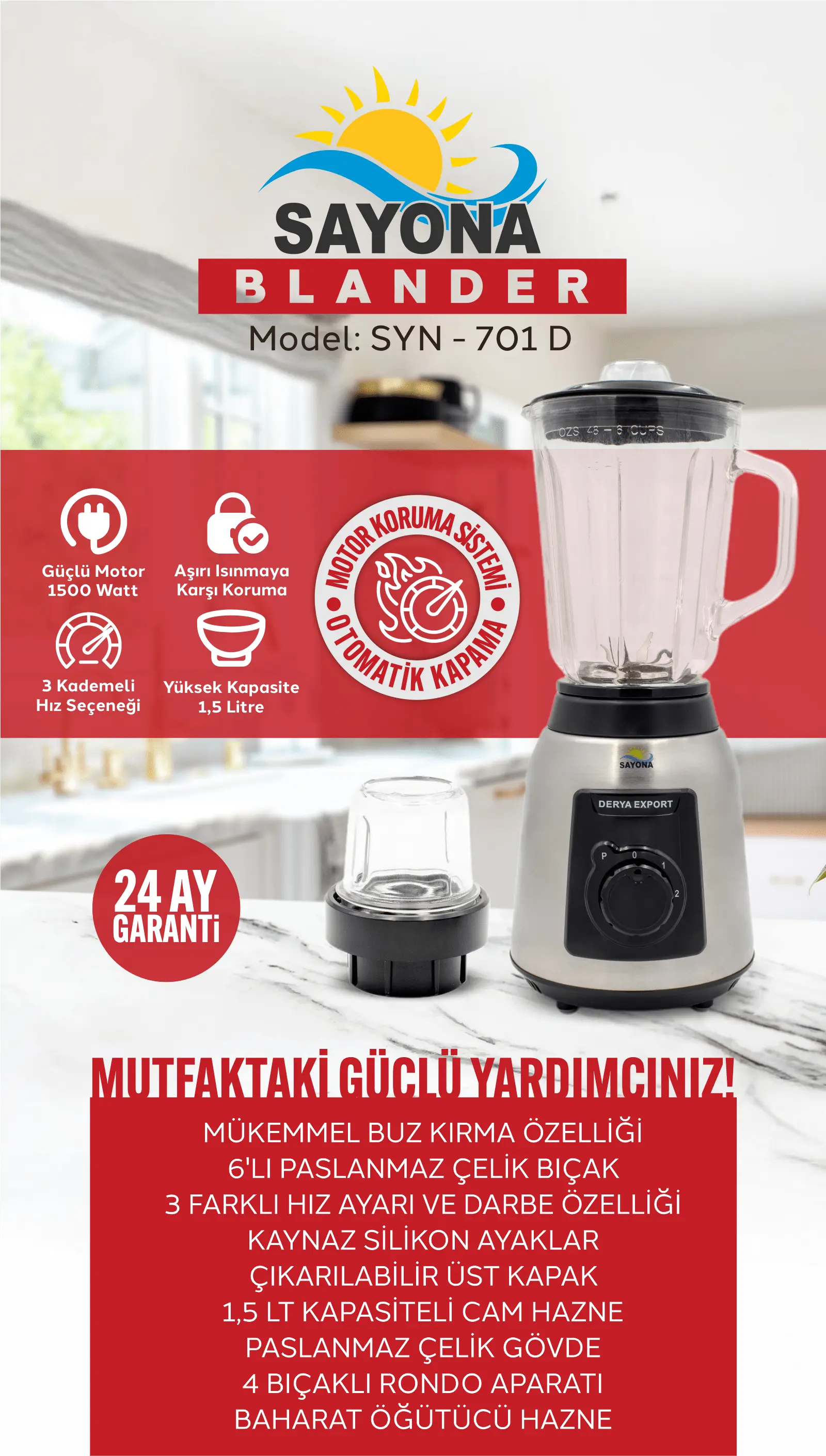 Mutfaktaki güçlü yardımcınız: Sayona Blender SYN-701 D! Bu blender, güçlü 1500 watt motoru, 6'lı paslanmaz çelik bıçağı ve 1,5 litre kapasiteli cam haznesi ile mutfakta ihtiyacınız olan her şeyi karşılar. İster buz kırma, ister smoothie hazırlama, ister baharat öğütme... Sayona Blender her işte yanında! 3 kademeli hız ayarı ve darbe özellikleri sayesinde istediğiniz kıvamı kolayca elde edebilirsiniz. Aşırı ısınmaya karşı koruma ve otomatik kapanma özelliği, güvenli bir kullanım sunar. Çelik gövdesi ve dayanıklı tasarımıyla uzun ömürlü bir mutfak arkadaşı arıyorsanız bu blender tam size göre. Ayrıca 24 ay garantiyle birlikte gelir.