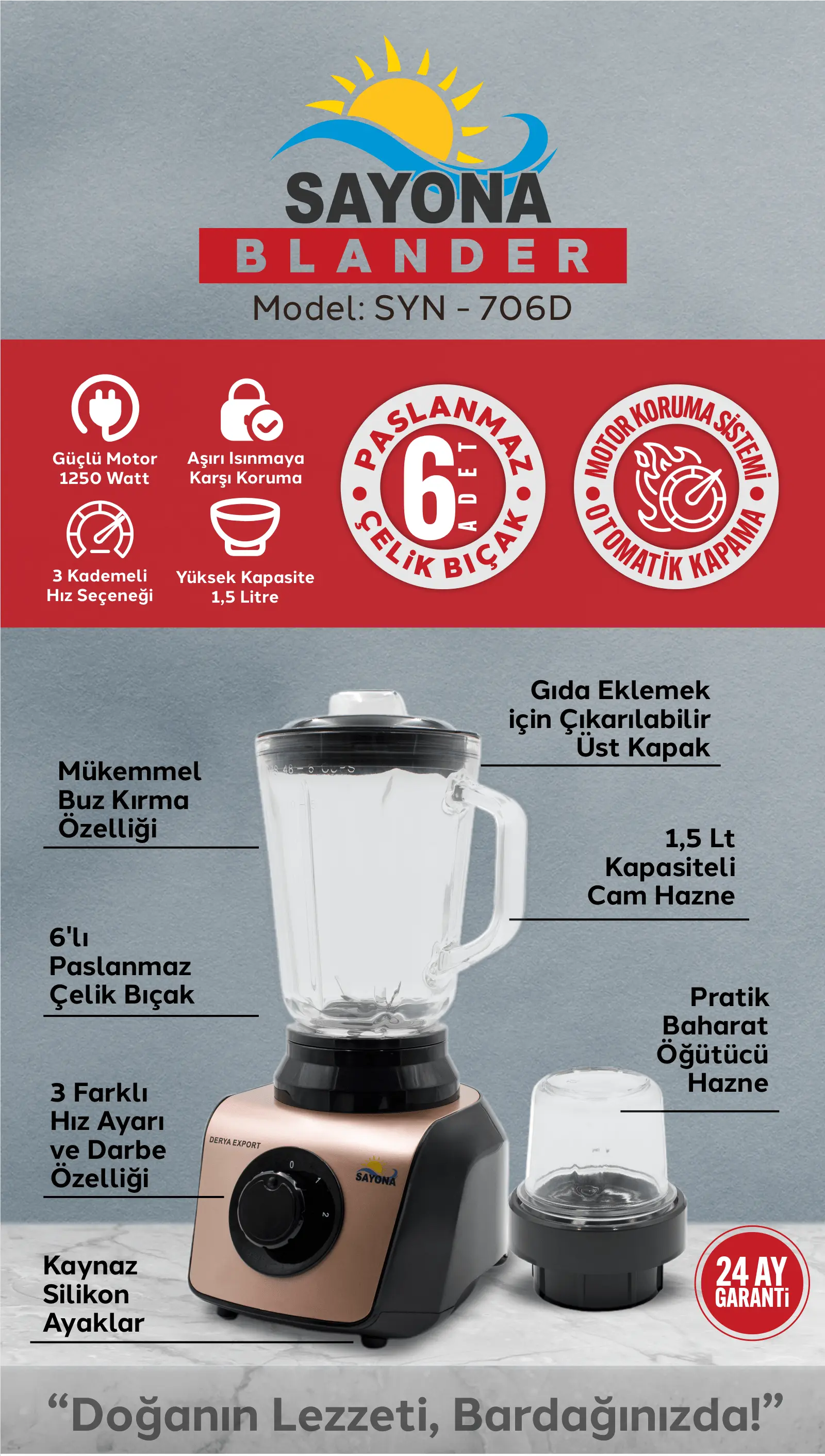 Doğanın lezzetini bardağınıza taşıyın! Sayona Blender SYN-706D, 1250 watt güçlü motoru ve paslanmaz çelik 6 bıçağıyla mutfaktaki en büyük yardımcınız olacak. İster buz kırın, ister smoothie hazırlayın, ister baharat öğütün... Bu blender tüm ihtiyaçlarınıza cevap verir! 1,5 litre kapasiteli cam haznesi sayesinde geniş bir kullanım sunar. 3 kademeli hız ayarı ve darbe özellikleriyle istediğiniz kıvamı kolayca elde edebilirsiniz. Çıkarılabilir üst kapak, kullanım sırasında pratiklik sağlarken, kaymaz silikon ayaklar güvenli bir kullanım sunar. Aşırı ısınmaya karşı koruma ve otomatik kapanma özellikleri ile dayanıklı bir tasarım sunan Sayona Blender, 24 ay garantiyle mutfakta yanınızda!