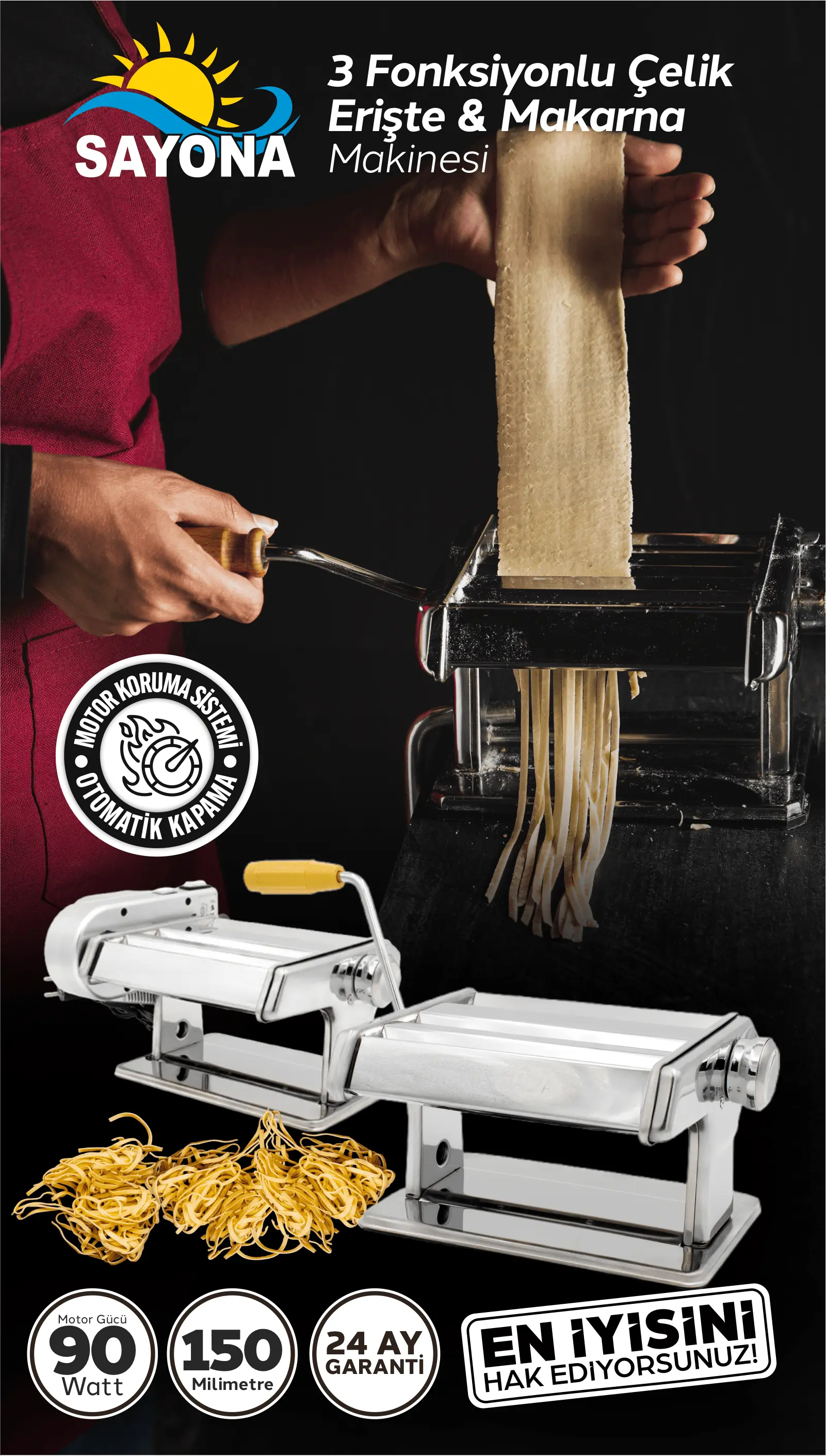 Sayona 3 Fonksiyonlu Çelik Erişte ve Makarna Makinesi ile mutfağınıza profesyonellik katın. Dayanıklı çelik yapısı, 90 watt motor gücü ve 24 ay garantisi ile uzun ömürlü kullanım sağlar. Ev yapımı lezzetlerinizi kolayca hazırlayın ve sevdiklerinizle paylaşın. Siz de kendi makarnanızı yaparak sağlıklı ve doğal bir deneyim yaşamak istiyorsanız, bu makine tam size göre!